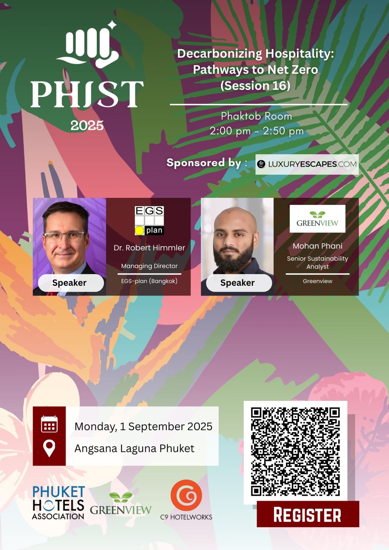 On September 1, 2025, EGS-plan (Bangkok) Co., Ltd. joined PHIST 2025 (Phuket Hotels for Islands Sustaining Tourism), hosted by the Phuket Hotels Association. The event gathered hotel owners, managers, engineering teams, and other stakeholders to advance sustainable, low-carbon business practices in hospitality.